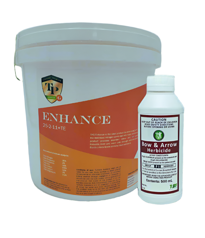 - Timing: Applying TPG Enhance first boosts lawn health, making it more resilient to herbicide application. The 2-week gap before Bow and Arrow protects new growth from potential herbicide stress, as juvenile grass can be sensitive.